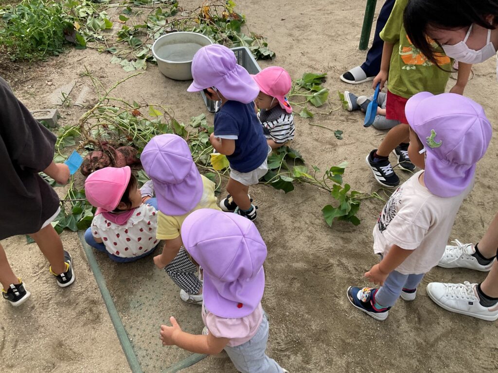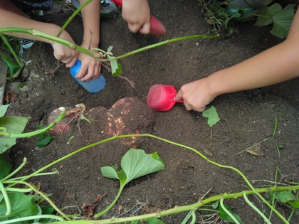 保育園では様々な野菜や果物を育てています。先週、夏前から育てていた、サツマイモを収穫しました
