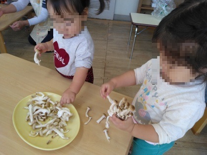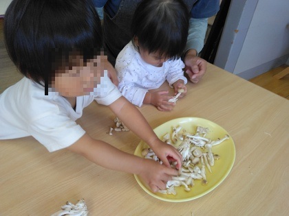 子ども達が小さくした、「えのきだけ」や「しめじ」で、雑炊を作ってもらい