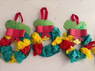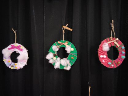 ↑ 0歳児クラス・花紙を丸めてリースを作りました。柊は手形です♪