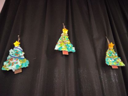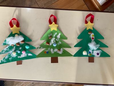 ↑ 5歳児クラス・ツリーの色を絵の具で塗り、好きなパーツで飾りをつけました